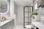 Det moderna och helkaklade badrummet med golvvärme erbjuder utmärkta tvättmöjligheter.