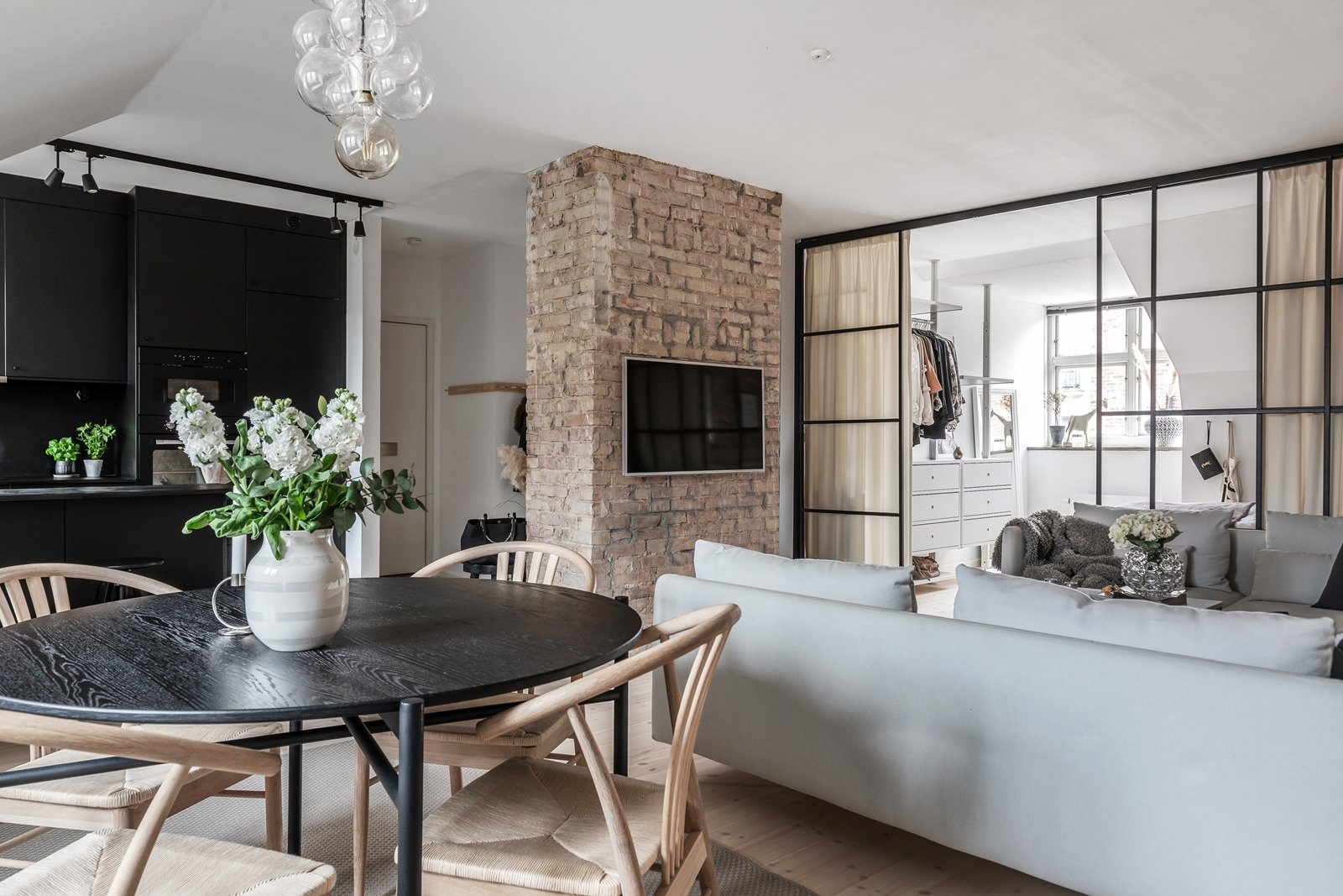 Vidare in i lägenheten möts ni av ett ljust och socialt vardagsrum med plats för både matgrupp och soffgrupp. Vardagsrummet bjuder dessutom på en charmig tegelvägg och även här vitlaserat brädgolv.