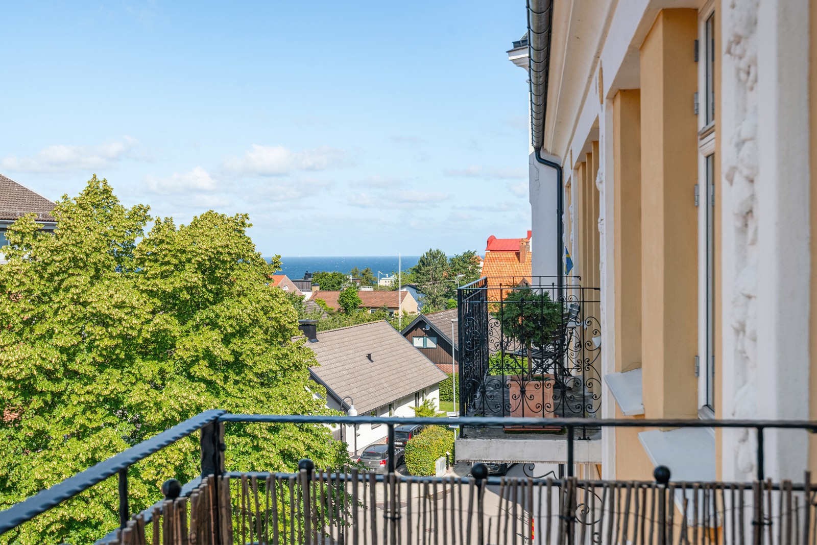 Bostaden är genomgående och badar i ljus tack vare stora fönster i två väderstreck. Två rum i fil vetter mot väster, där du kan njuta av solen hela dagen på balkongen tills den faller bakom trätopparna och sundet. Mot den grönskande innergården ligger köket och sovrummet – här strömmar morgonsolen in och ger en rogivande atmosfär med utsikt över gårdens lummighet.
