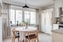 Till höger från entrén nås det generösa köket, där det finns plats för matbord. Köket har vita skåpsluckor som stilrent kombineras med grått kakel. Utrustningen består av kyl och frys, ugn, spis med häll samt diskmaskin. På golvet vilar ett slitstarkt laminatgolv.