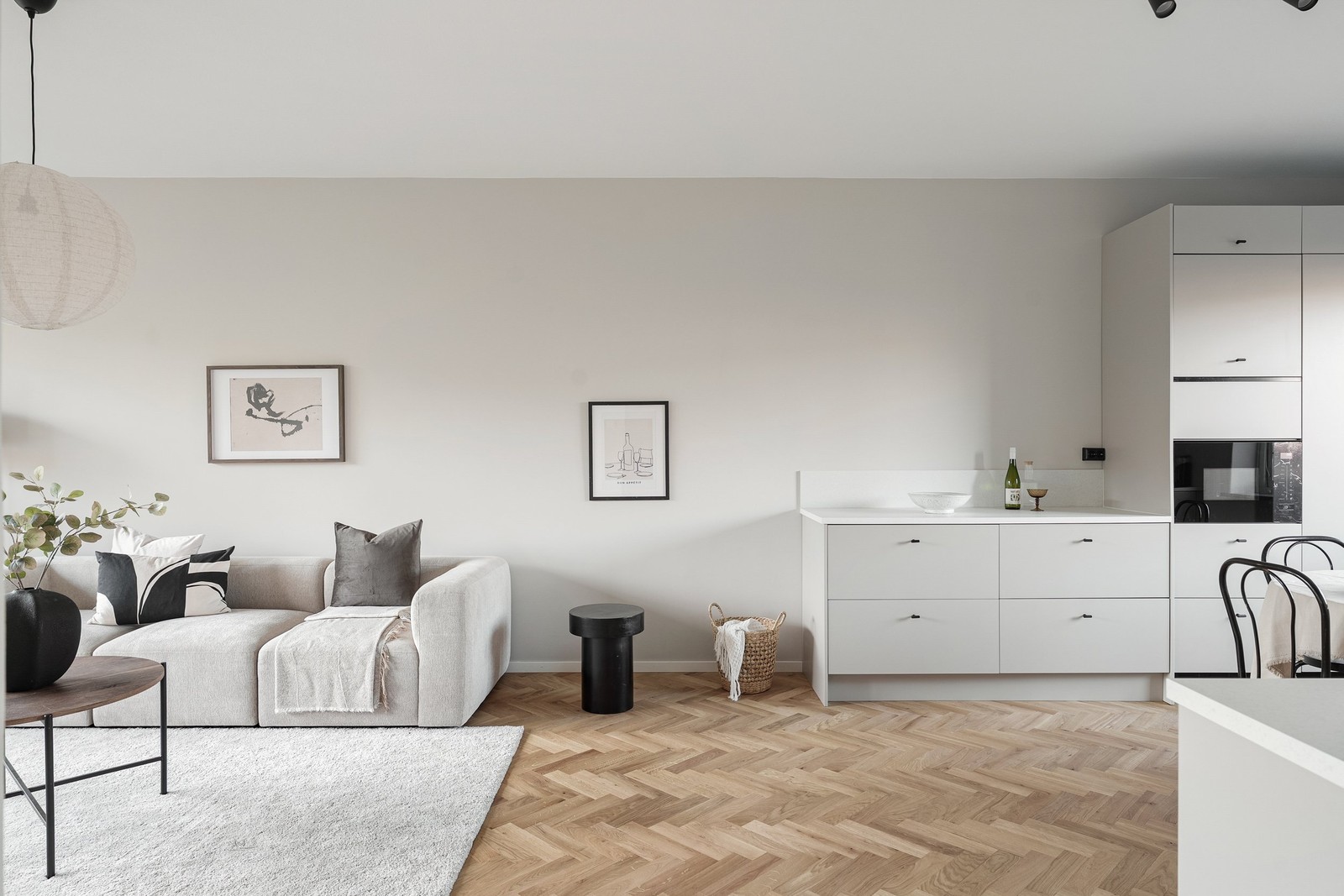 Redan i entrén sätter den nylagda fiskbensparketten tonen och löper enhetligt genom hela bostaden. Tillsammans med nymålade väggar i mjuka nyanser skapas en varm och stilren helhet som ger ett direkt inbjudande intryck.