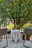 Lummig innergård med mycket grönska, utemöbler och grillplats.