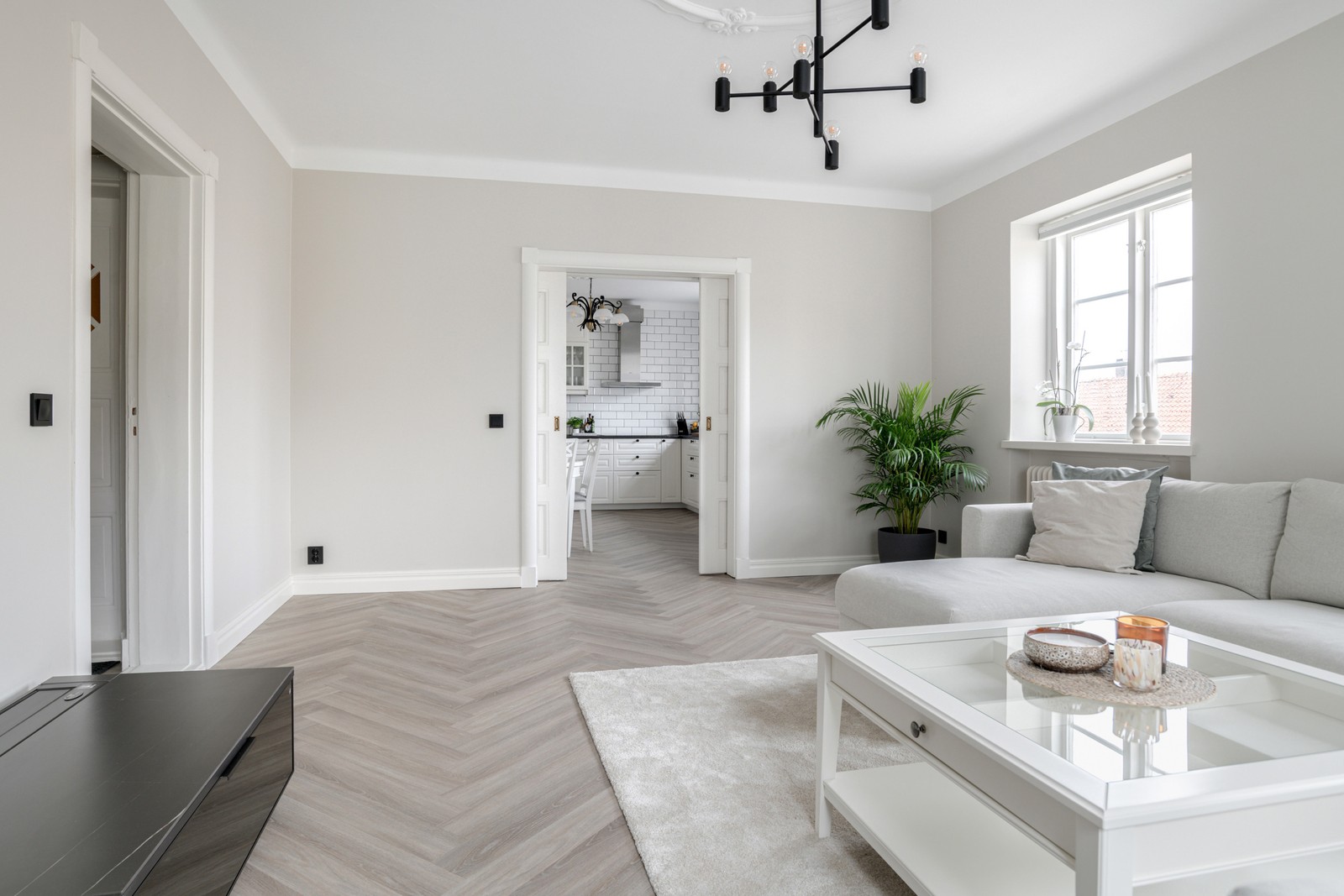 Väl innanför dörren välkomnas ni av en rymlig hall med goda användningsmöjligheter. Här ligger ett stilfullt, vackert vinylgolv som löper vidare genom hela bostaden.