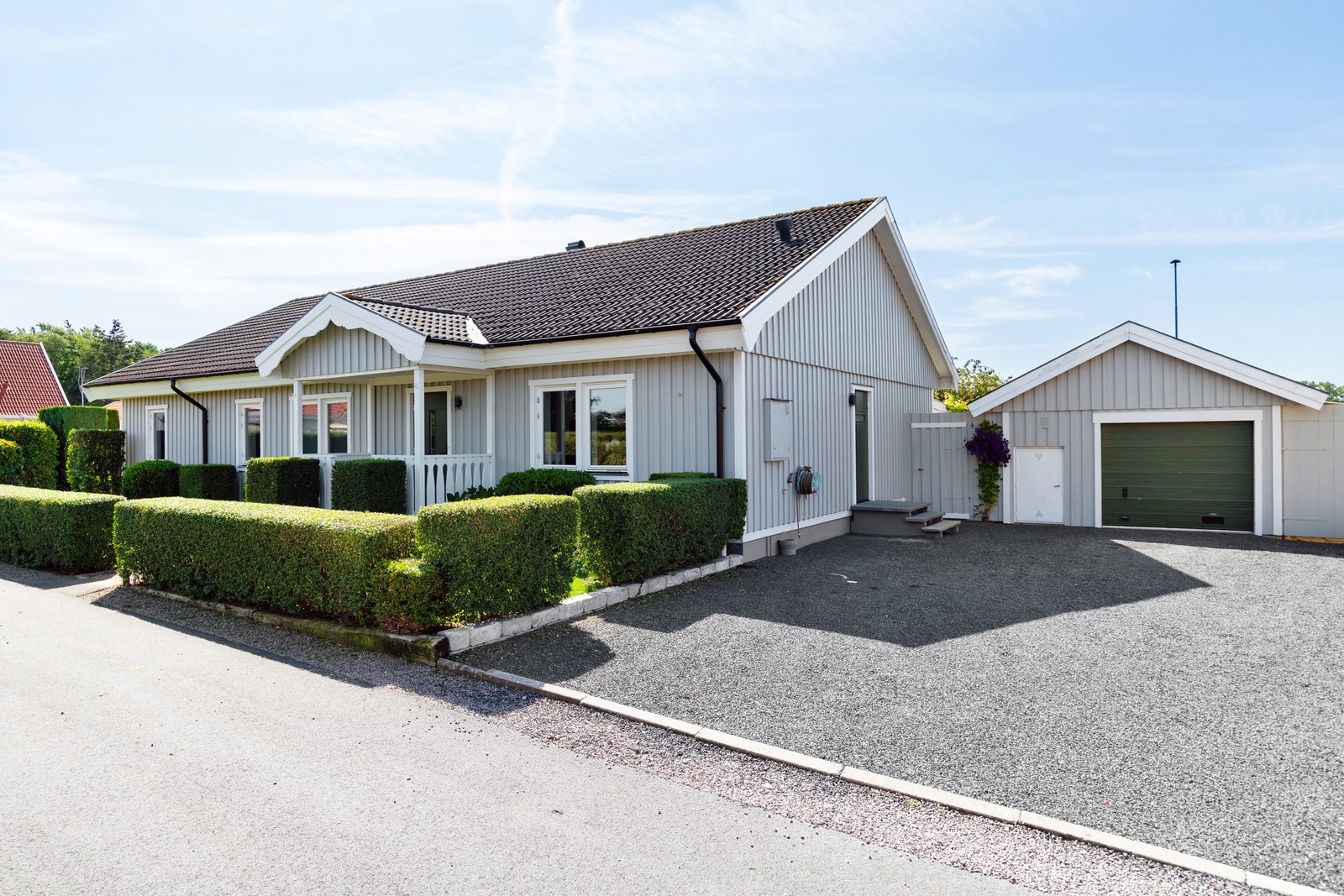 Längs med Hyllestigen finner ni denna 1-plansvilla med fantastiskt trädgård, garage och uterum.