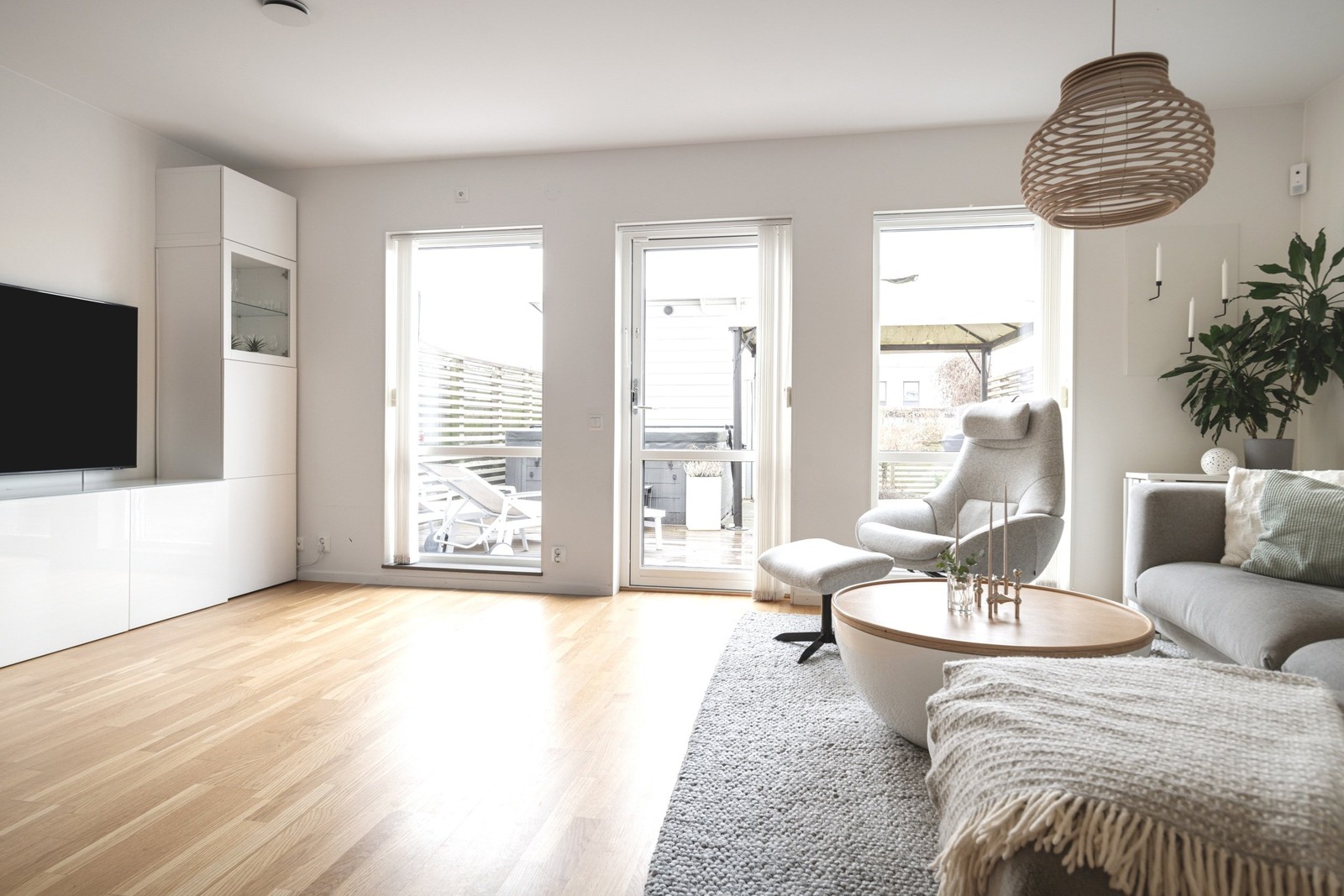 Det öppna, sociala och framförallt luftiga vardagsrummet har generösa fönsterpartier ut mot det stora trädäcket i väster och släpper in solens härliga eftermiddag och kvällssol! På hela entréplanet finns det vattenburen golvvärme som ger en varm och behaglig vardagskomfort.