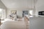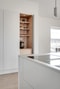 Kök från HTH med högskåp och köksö helklädd i Caesarstone ”Clamshell ”. Vask specialbeställd även den helt i Caesarstone ”Clamshell”. Allt handtagslöst, med motor till kyl/frys för att kunna öppna dessa. Synliga vitvaror (ugn, ugn/mikro, spishäll med integrerad fläkt och vinkyl) alla från Miele. Resterande integrerade vitvaror från Siemens. Kaffeskåp med spotlights och el. Punktbelysning över köksön från ”Buster and Punch”.