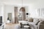 Vidare in i bostaden öppnar vardagsrummet upp sig – ett större och luftigt rum med plats för både soffgrupp och sänghörna. Även här återkommer det ljusa parkettgolvet och de stilrena väggarna i harmoniska, ljusa nyanser som förstärker känslan av rymd och lugn.
