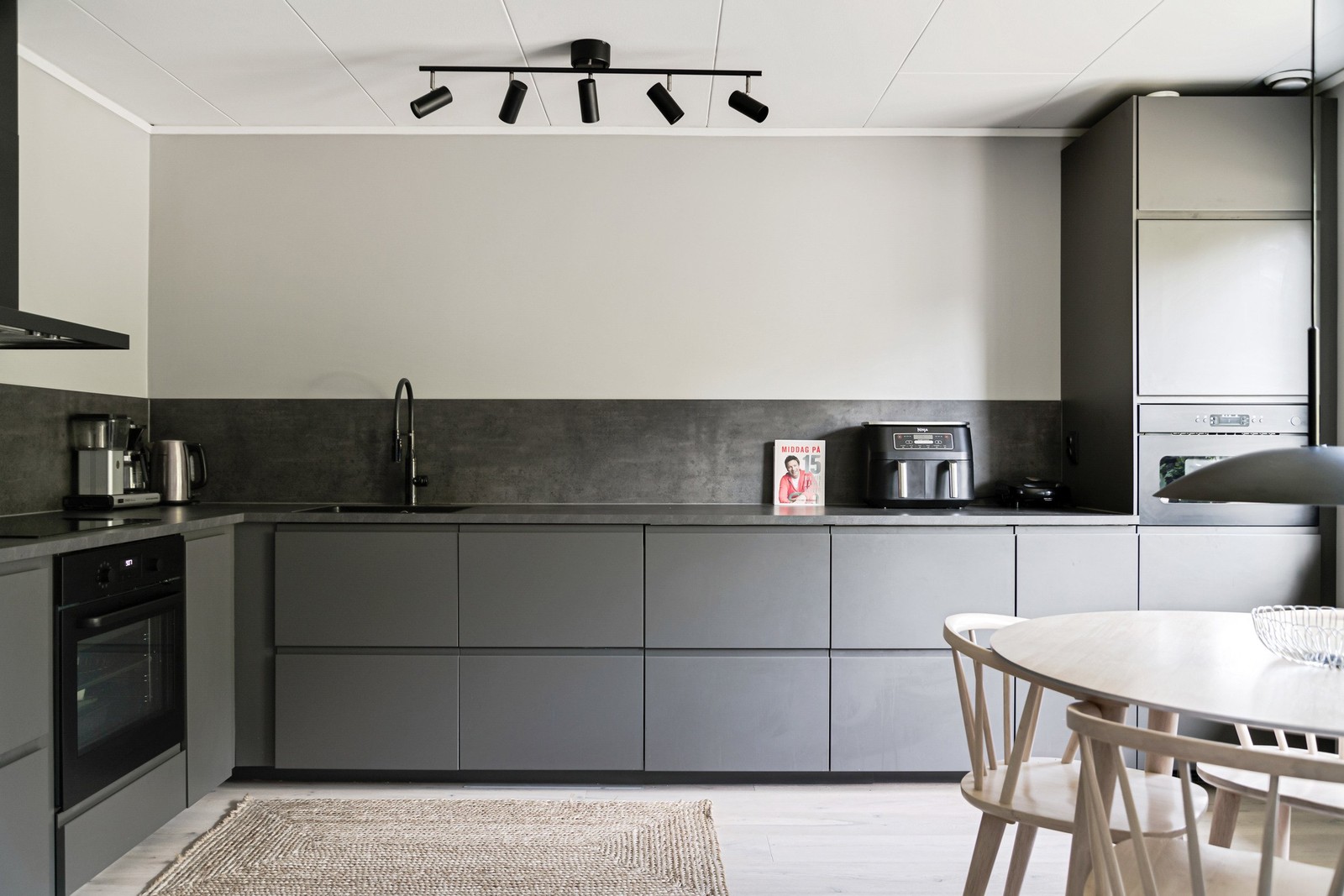 Huset byggdes 1988 och kompletterades med en frånluftsvärmepump med värmeåtervinning 2025. Det har en genomtänkt planlösning där de sociala ytorna ligger i bottenplan och sovrummen på övervåningen. Hallen pryds av ett klassiskt vit- och svartrutigt golv. Här ryms både ytterkläder och skor. I det intilliggande köket är väggarna målade i en mjuk, blågrå nyans och golvet utgörs av en parkett i ljust trä. En träfärgad bänkskiva gör rummet hemtrevligt. Här finns gott om förvaring bakom de vita släta skåpsluckorna. Vitvarorna kommer från Electrolux och är även de vita.