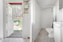 Till vänster ett nytt badrum med plastmattor på vägg och golv, dusch, toalett och handfat. Golvvärme.