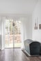 Trivsamt vardagsrum med parkettgolv och väggar med väv som målades om 2026. Rummet erbjuder fint ljusinsläpp och gott om plats för både soffgrupp och övrigt möblemang. Härifrån upplevs den öppna planlösningen mot köket som skapar en social och luftig känsla i bostaden.