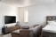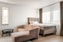 Allrummet rymmer både soffgrupp och säng. De stora fönstren ger ett fint ljusinsläpp och gör rummet till en trivsam plats att umgås eller koppla av på. Neutrala toner och genomgående fina ytskikt gör det enkelt att sätta sin egen prägel.