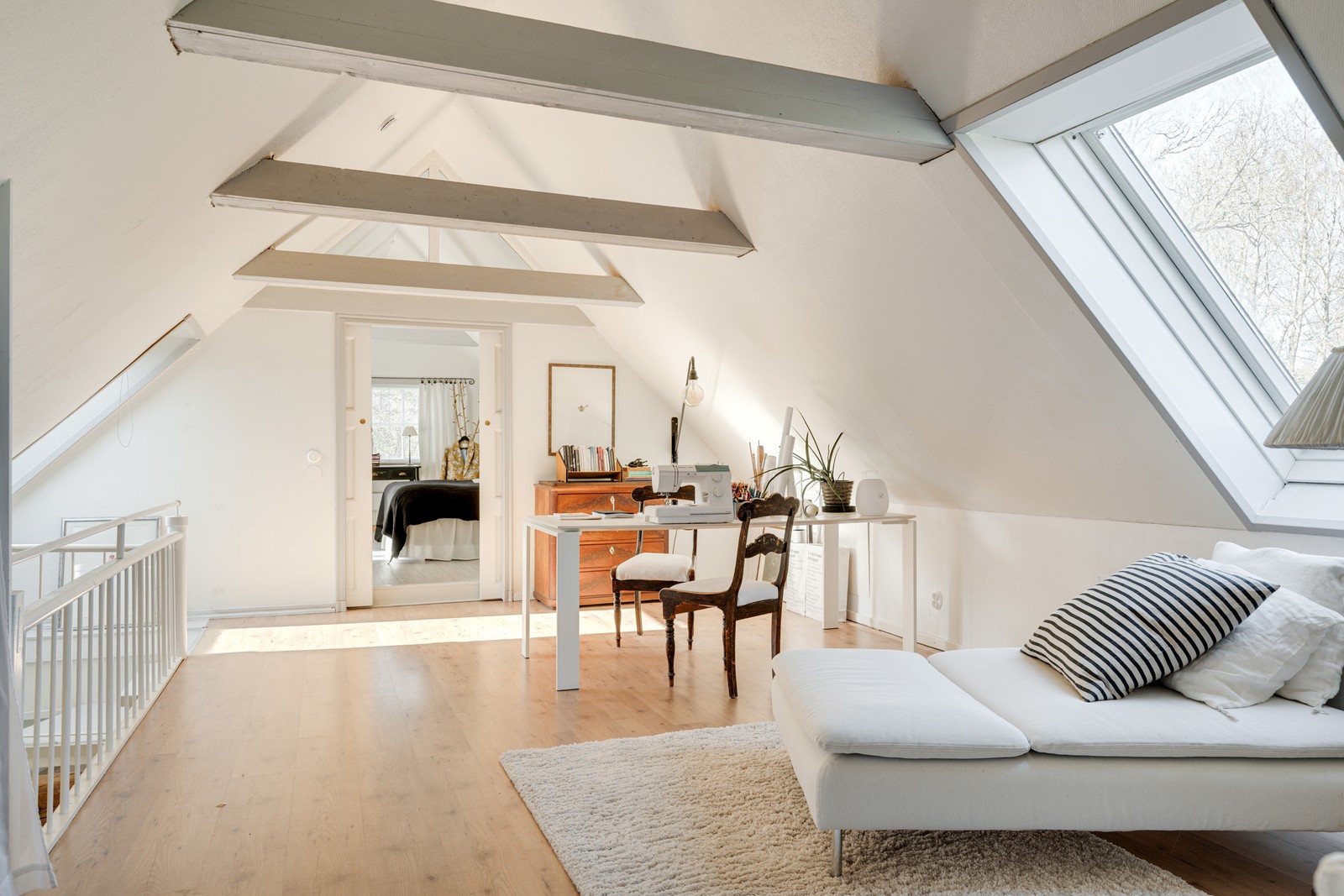 Via spiraltrappa i matsalen nås mellanlängans ovanvåning. Här finns ett rymligt allrum med stort ljusinsläpp och öppet upp i nock – en plats som lämpar sig väl för avskildhet eller kreativ verksamhet. På ena sidan ligger ett större sovrum med tillhörande klädrum och fransk balkong. På andra sidan finns ytterligare ett badrum.
