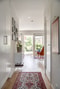 Ni stiger in i en ljus och välkomnande hall, med grått klinkergolv och goda förvaringsmöjligheter. Direkt till höger ligger ett gäst-WC med dusch, helkaklat i neutrala toner. Här finns takdusch, kommod, spegelskåp och infällda spotlights – både stilrent och funktionellt.