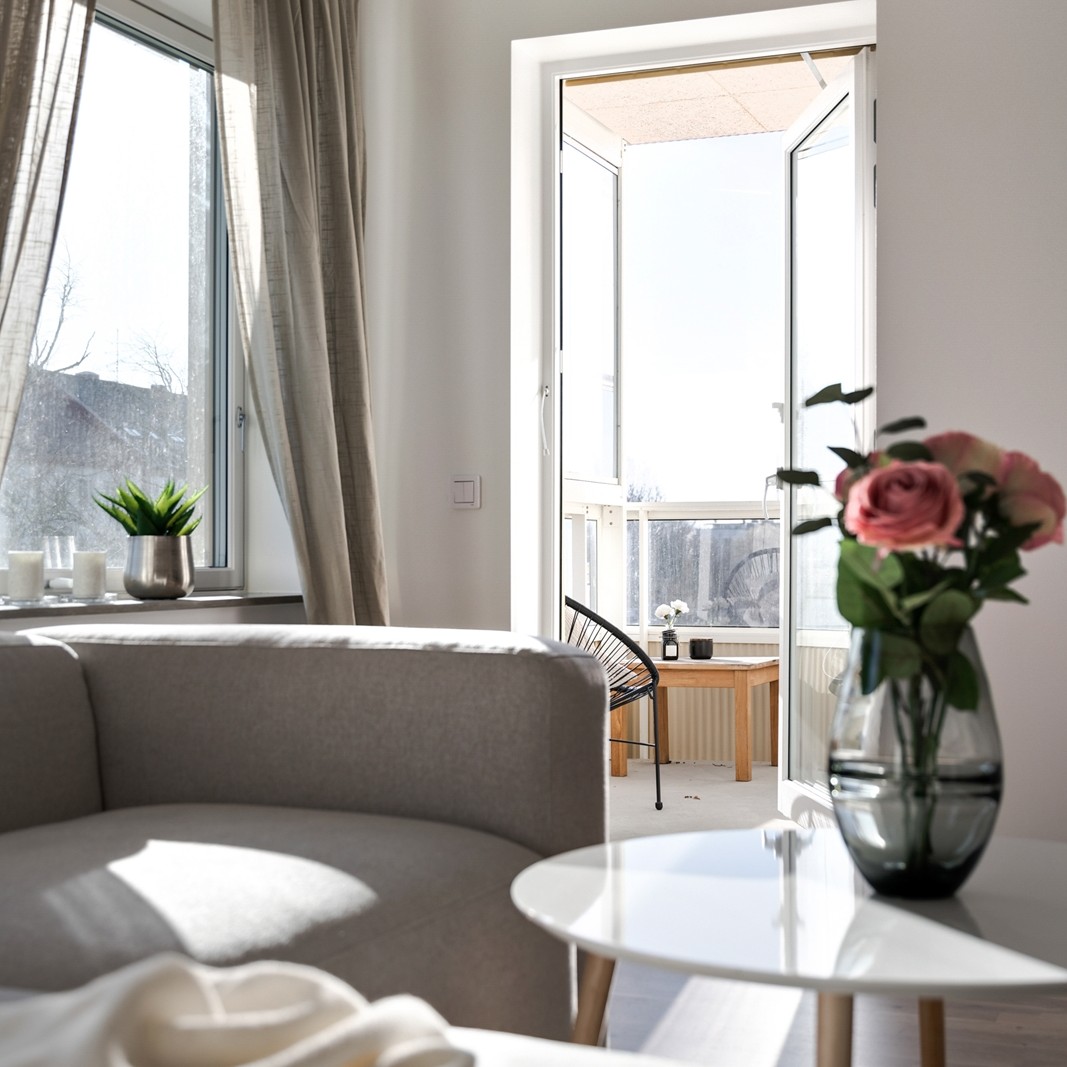 Lägenheten är inredd med påkostade materialval med ljust kök från vedum, helkaklat badrum med dusch och separat del med tvättmaskin, torktumlare och bra förvaringsmöjligheter. Kök och allrum är i öppen planlösning och de stora fönstren ger ett fint ljusinsläpp.