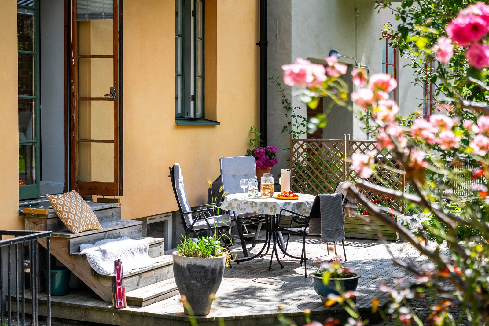 Stilren tvåa med solig uteplats och fri utsikt – attraktivt boende med låg avgift och hög komfort.