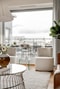 Med fönsterpartier längs väggen mot väster sträcker sig den långa hallen vidare in mot den sociala avdelningen där kök, sällskapsrum och matplats förenas. Här är det luft och ljus som spelar huvudrollerna med genomgående ljusinsläpp från öst till väst. Kontakten med utemiljön är ständigt närvarande tack vare de stora glaspartierna som vetter ut mot den stora terrassen som fungerar blir en utökning av de sociala ytorna under sommarmånaderna. Rummets härliga volym och självklara indelningar gör det enkelt att ha utrymme för både vardagsro och fest. Köket breder ut sig i vinkel med interiör från Myresjö med släta, blanka luckor i vitt med rostfria grepp samt matchande arbetsbänk och väggkakel i grått. Maten tillagas på köksön som har en central och social placering utåt matplatsdelen. Här finns även en högre bordsdel där väntande gäster kan slå sig ner med ett glas i väntan på middagen.