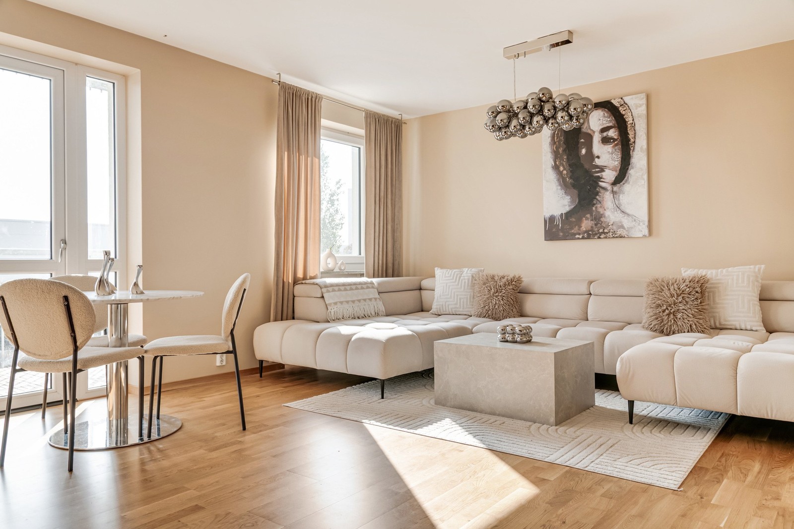Ljus och modern trerummare med två badrum, balkong, hiss, parkeringsplats och låg avgift.