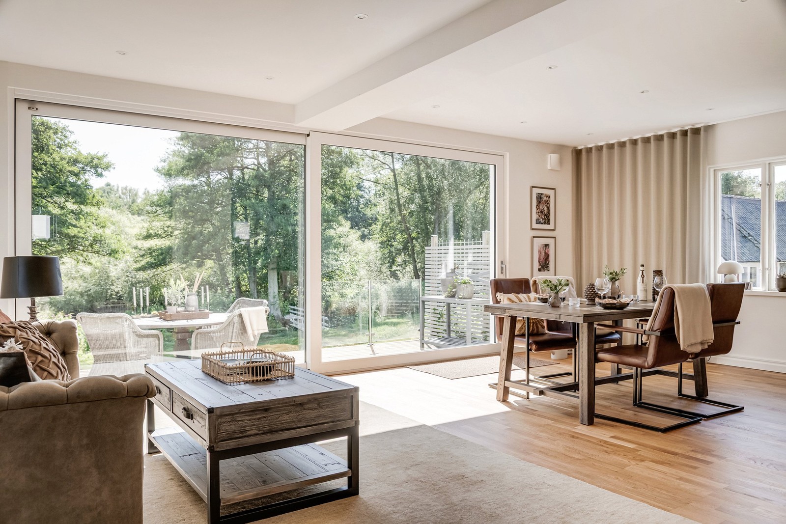 Från vardagsrummet kliver ni direkt ut på det generösa trädäcket – en oas med plats för långa frukostar i morgonsolen, grillkvällar i solnedgången eller bara stilla stunder med en bok och naturen som sällskap. En trappa leder dig ner mot ån där vattnet glittrar och du kan doppa fötterna en varm sommardag.