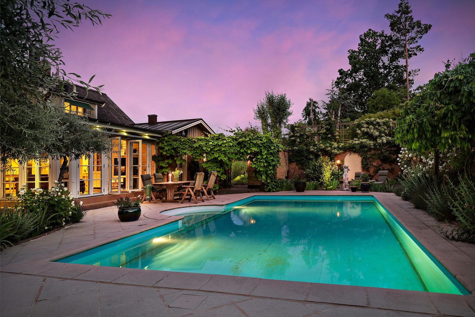 Poolen har måtten 10x5m med en gjuten platta med uppmurade block, liner, reningsverk och sandfilter. Poolen värms upp med solfångare samt fastighetens värmesystem. Innergården består av 100kvm stensatt yta. Där finns ett flertal planteringar med bland annat Rosor, Blåregn, Klätterhortensior, Näsduksträd med mera. På innergården finns det även en murad jordkällare med gjutet tak och el indraget.