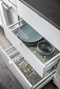 Det stilrena köket från IKEA är både funktionellt och inbjudande. Vita luckor kombineras med mörk laminatskiva och ett exklusivt väggkakel i mörk ton som ger en modern kontrast. Köket är utrustat med kyl, frys, ugn och diskmaskin (aldrig använd med testad nu så den fungerar). Här finns även plats för ett matbord vid det stora fönstret som släpper in rikligt med dagsljus.