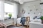 Till höger finner vi ett av sovrummen rofyllt placerat och i nära anslutning till badrummet. Här finns gott om plats för säng, skrivbord och förvaringsmöbel. Det stora fönstret ger ett fint ljusinsläpp. Väggarna är tapetserade i en rogivande blå nyans och på golvet ligger laminat.