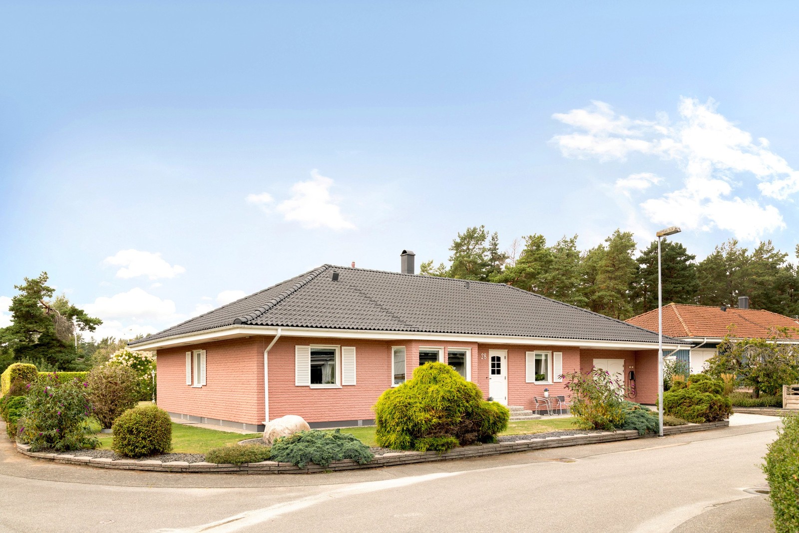 Rymlig enplansvilla med fyra sovrum, bubbelpool, uterum och solig hörntomt nära Åhus strand.