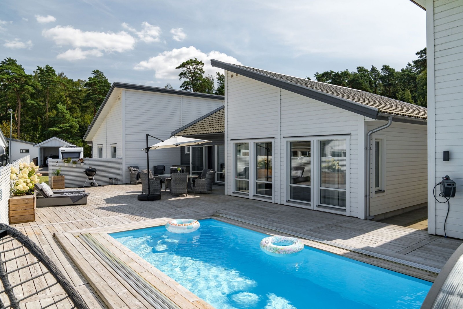 Energisnål enplansvilla med härligt poolområde, dubbelgarage och solceller