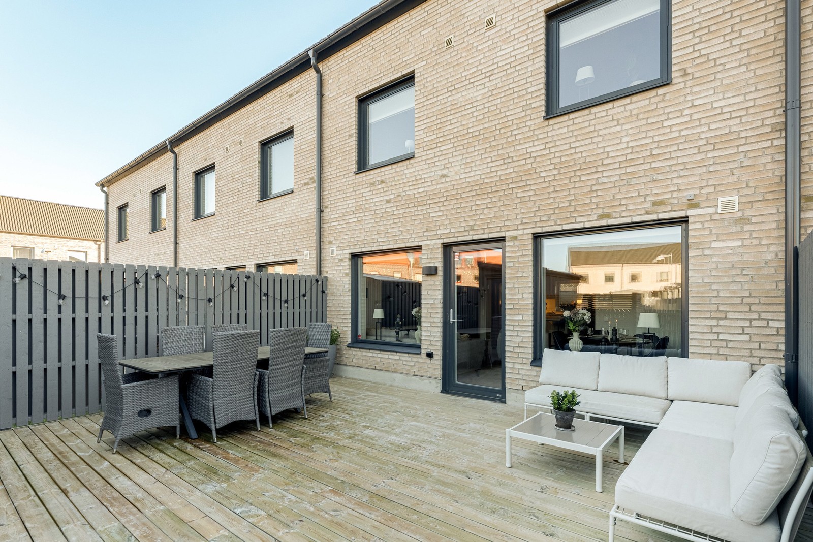 De välbyggda gathusen i Brf Vårbruket smälter perfekt in i det nya området norra Borstahusen och har vackert teglade fasader, stora fönsterpartier med härligt ljusinsläpp samt kvalitetsinredning i form av kök från Marbodal. Planlösningen är optimal för familjen och bjuder på en luftig och social planlösning på entréplanet med utgång till den inhägnade trädgården med tillhörande trädäck och uteplats, två rymliga badrum på båda planen och tre bra sovrum samt ett mindre allrum och synnerligen gott om förvaringsmöjligheter. Allrummet kan med enkelhet göras om till ett fjärde sovrum om så önskas. För maximal komfort är det vattenburen golvvärme på hela entréplanet.