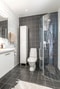 På entréplanet hittar vi också ett helkaklat badrum med grått klinkergolv och vitkaklade väggar. Här finns vattenburen golvvärme och en utrustning bestående av wc, kommod med handfat, badrumsskåp och dusch.