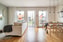 Vardagsrummet bjuder på god plats till både matsalsmöblemang och soffgrupp. Tack vare de stora fönsterpartier och altandörren i glas som vetter mot trädgården så har bostaden ett mycket fint ljusinsläpp och under sommarhalvåret suddas gränsen mellan vardagsrum och trädäck ut och skapar en gemensam stor härlig social yta.