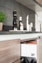 Inredningen här går i mörka toner och är inrett med: tvättmaskin, torktumlare, diskho och förvaring.