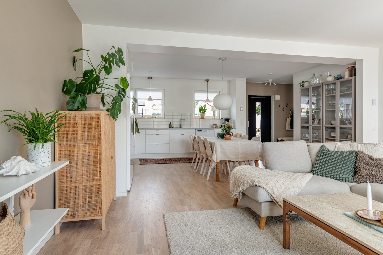 Planerat med härliga sociala ytor, trädgård med trädäck i söderläge, två biluppställningsplatser intill huset och tre väl tilltagna sovrum!
