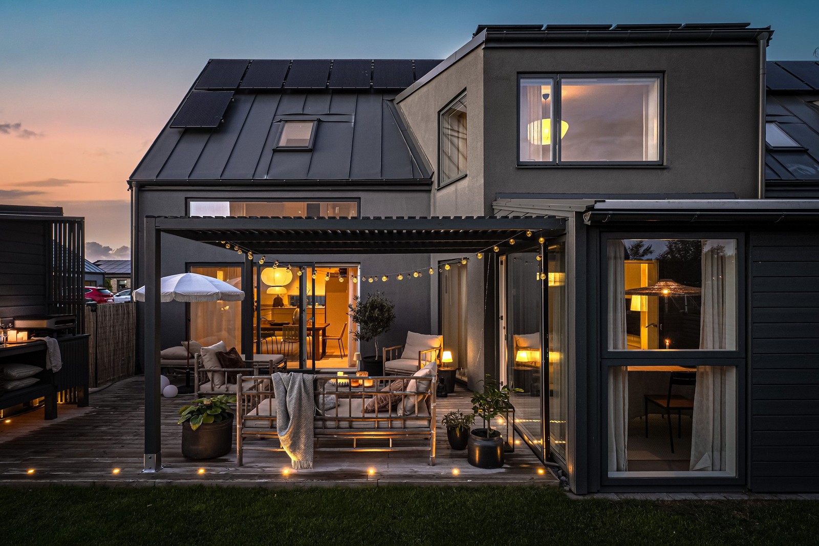 De stora öppningsbara fönsterpartierna tar er från vardagsrummet vidare ut till trädgårdens, här möts ni av en insynsskyddad trädgård med fina uteplatser. Njut av solen under dagen och passa på att ta ett glas vin under pergolan medan pizzan bakas.