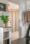 Ni välkomnas in i en ljus hall med möjlighet för att hänga av sig ytterkläderna. På golvet ligger vitlaserat ek-golv som är genomgående för hela lägenheten.