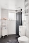 Helkaklat badrum som genomgått stambyte under 2020. Badrummet är inrett med: vägghängd toalett, vask med tillhörande kommod, handdukstork, dusch och badrumsskåp.
