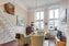 Tarkett laminatgolv kombineras med vacker bröstpanel och tapetserad väggar. Stora fönsterpartier.