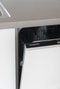 Badrummet går i stilrena toner. På golvet ligger en mörkgrå klinker och på väggarna sitter ett blankt vitt kakel. Här får du gott om förvaring i kommod samt praktiskt spegelskåp från Svedbergs. Rundade duschväggar i glas, spotlights i taket och elektrisk handdukstork bidrar till komforten. Här finns även en tvättmaskin och torktumlare från Siemens placerade under en bänkskiva och väggskåp med vita luckor.