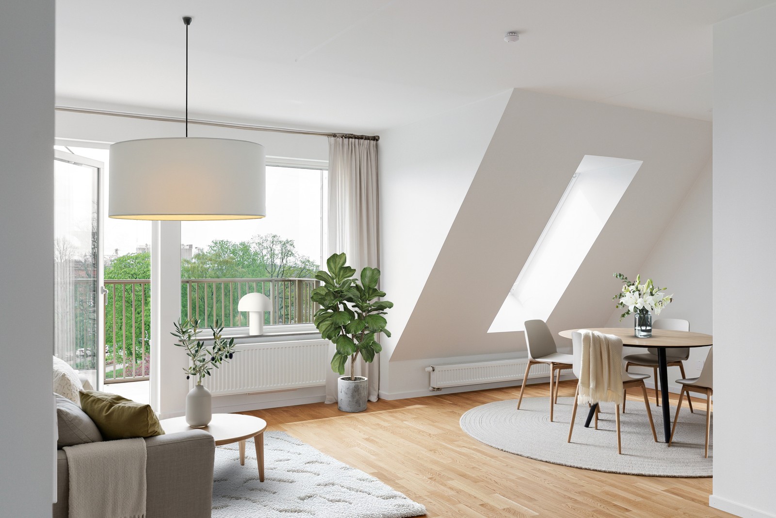 Nybyggd och rymlig vindsvåning om hela 70 kvm med härlig balkong i solsäkert västerläge med utsikt över Teaterparken. Föreningen har fått bygglov för att glasa in balkongerna så denna yta kan användas under en ännu större del av året! Här välkomnas du till en helt inflyttningsklar och unik lägenhet med stora sociala ytor och fint ljusinsläpp från takfönster och takkupa. Lägenheten har ca 2,5m i takhöjd, fina parkettgolv i ek och genom hela bostaden finns charmen av snedtak vilket även ger extra golvyta.