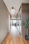 I hallen finns en lång skjutdörrsgarderob med spegelglas som fungerar som förråd och plats för ytterkläder. Modern panel har satts upp vid ingången och skapar en ombonad känsla.