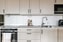 Vardagsrum och kök har modern öppen planlösning med inredning från Marbodal med stilrena beige luckor med läckra svarta handtag och belysning under skåpen, blandare Tapwell, ljus bänkskiva och matt liggande kakel ovanför. Utrustningen består av induktionshäll Siemens, ugn Siemens, micro Siemens, kylskåp i rostfritt Siemens, frys i rostfritt Siemens och integrerad diskmaskin Siemens.