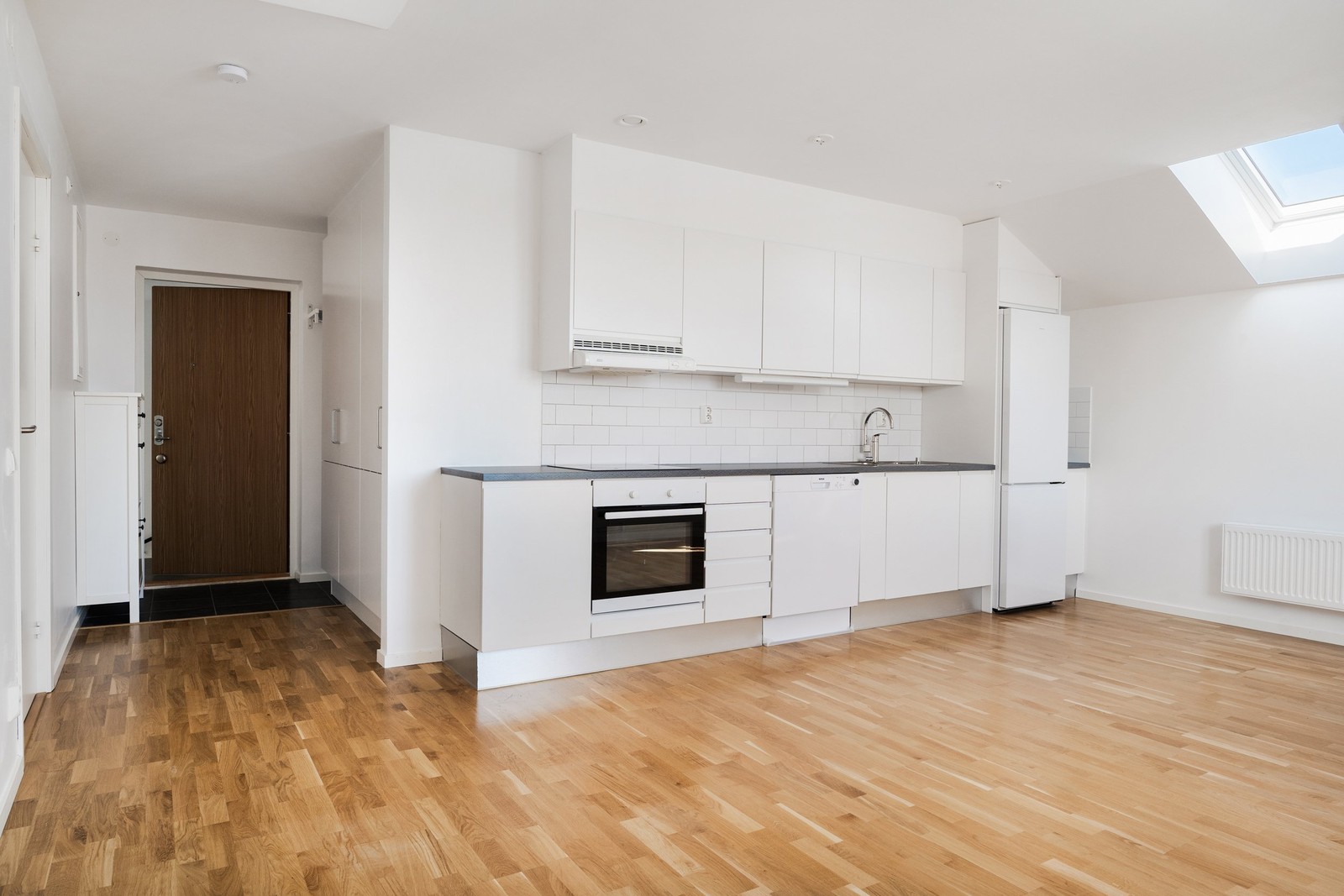 Vardagsrum / Kök : Parkettgolv och vita målade väggar. Kök från JKE-köksdesign. Kombinerad kyl/frys från Samsung, diskmaskin 2026 Silez, spilhäll och ugn Cylinda.