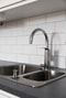 Parkettgolv och vita målade väggar. Kök från JKE-köksdesign. Kombinerad kyl/frys från Samsung, diskmaskin 2026 Silez, spilhäll och ugn Cylinda.