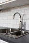 Badrummet är helkaklat och utrustat med både tvättmaskin och torktumlare. Läcker duschhörna med vikbara duschdörrar i klarglas. Gott om förvaring i kommoden och spegelskåp ovanför handfatet.