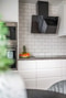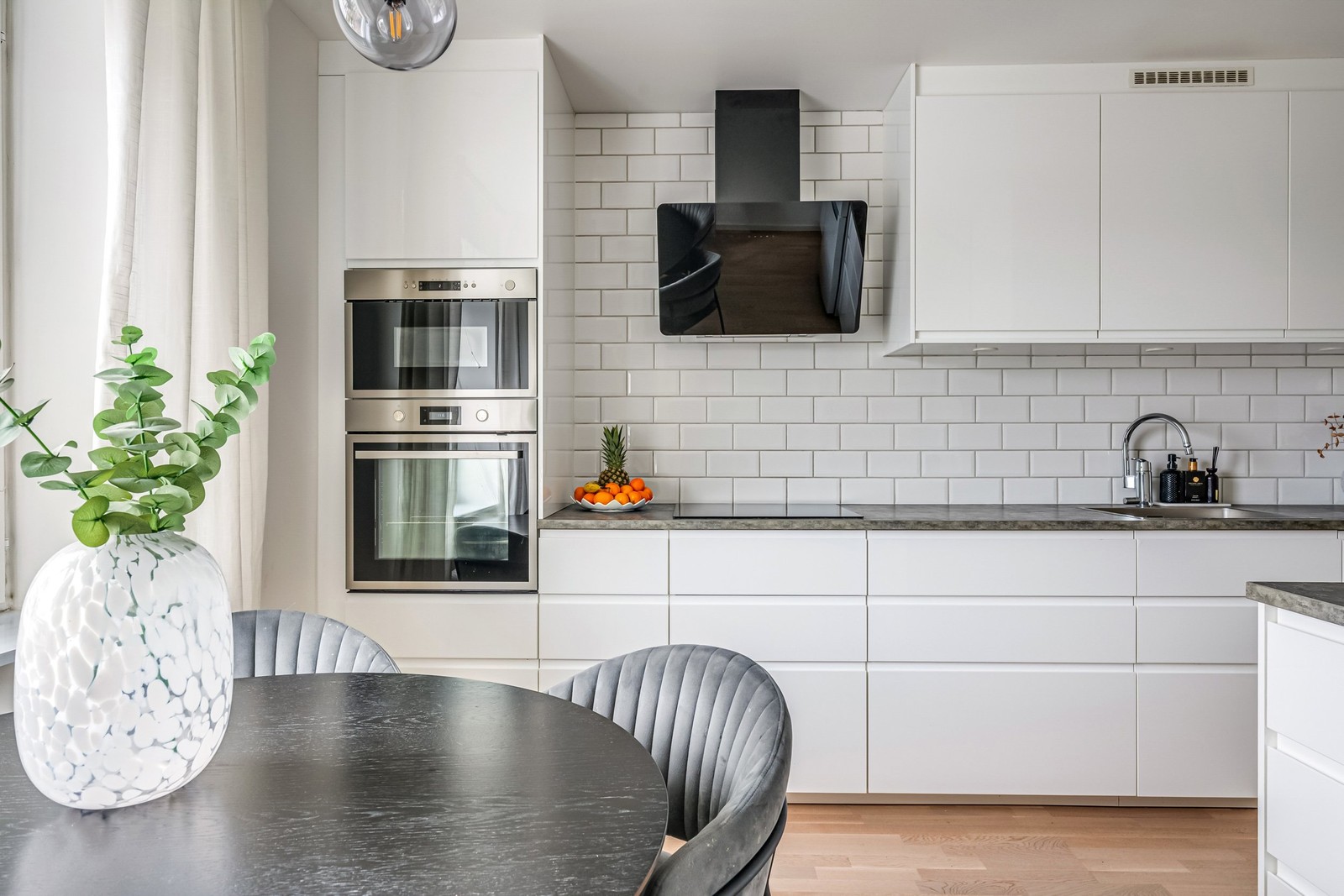 Väl tilltaget kök från IKEA med gott om förvaring som totalrenoverades 2022. Vita skåpsluckor matchas med vitt kakel och gråsvart bänkskiva. Självrengörande ugn i rostfritt, integrerad mikro, induktionshäll, kolfilterfläkt, kombinerad kyl och frys samt integrerad diskmaskin.
