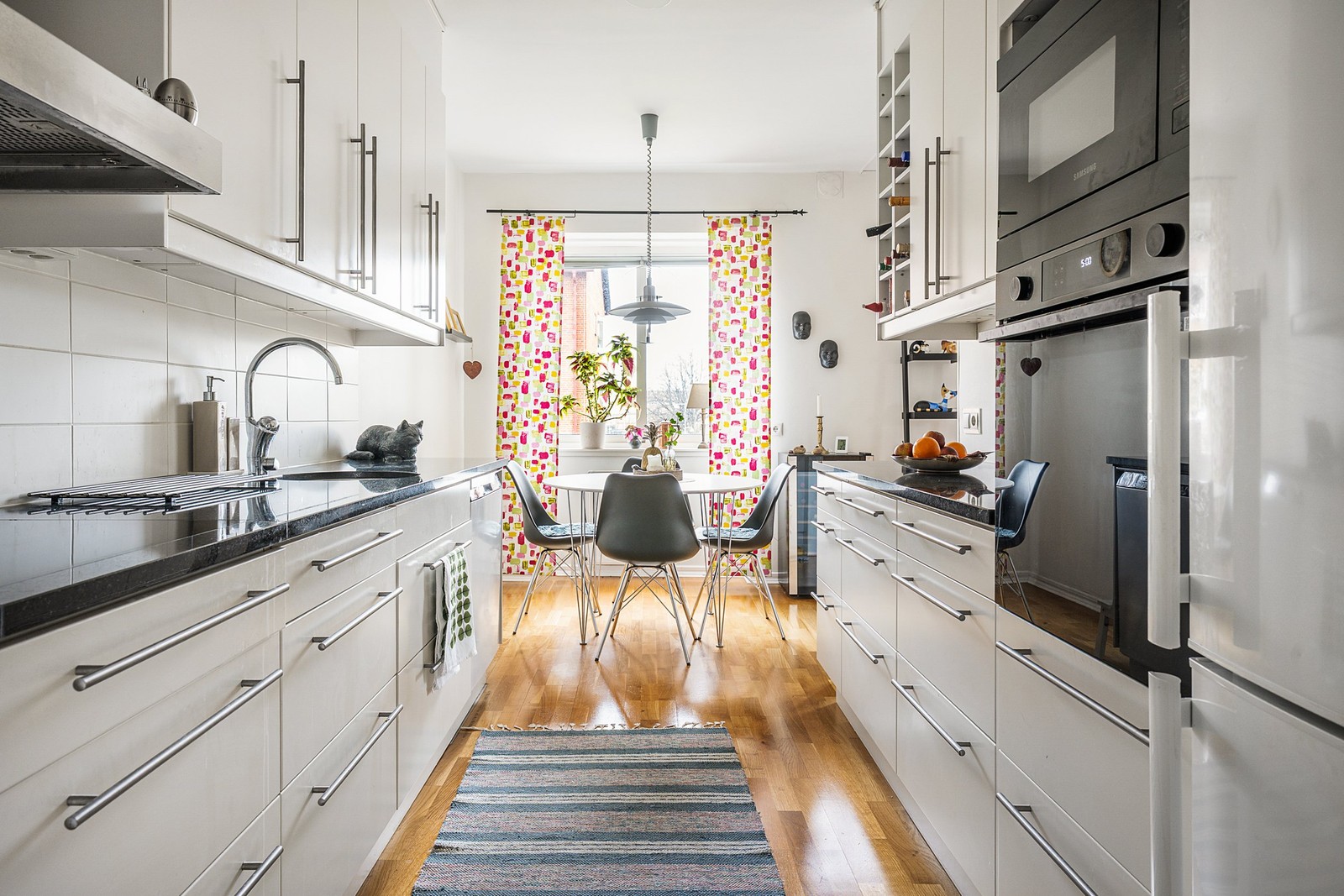Ett modernt stilrent kök som går i en vi kulör, inrett med en god förvaring och bra med avlastningsytor. Mellan kök och vardagsrum är det en semi-öppning och tack vara detta sammanflätas kök, vardagsrum och den inglasade balkongen på ett helt otroligt vis. Njut av härliga middagar och duka upp för stora sällskap. Köket är inrett med: kyl/ frys, diskmaskin, spishäll, inbyggd ugn, köksfläkt, inbyggd mikro samt diskho. Bänkskivan i granit blir som kronan på verket.