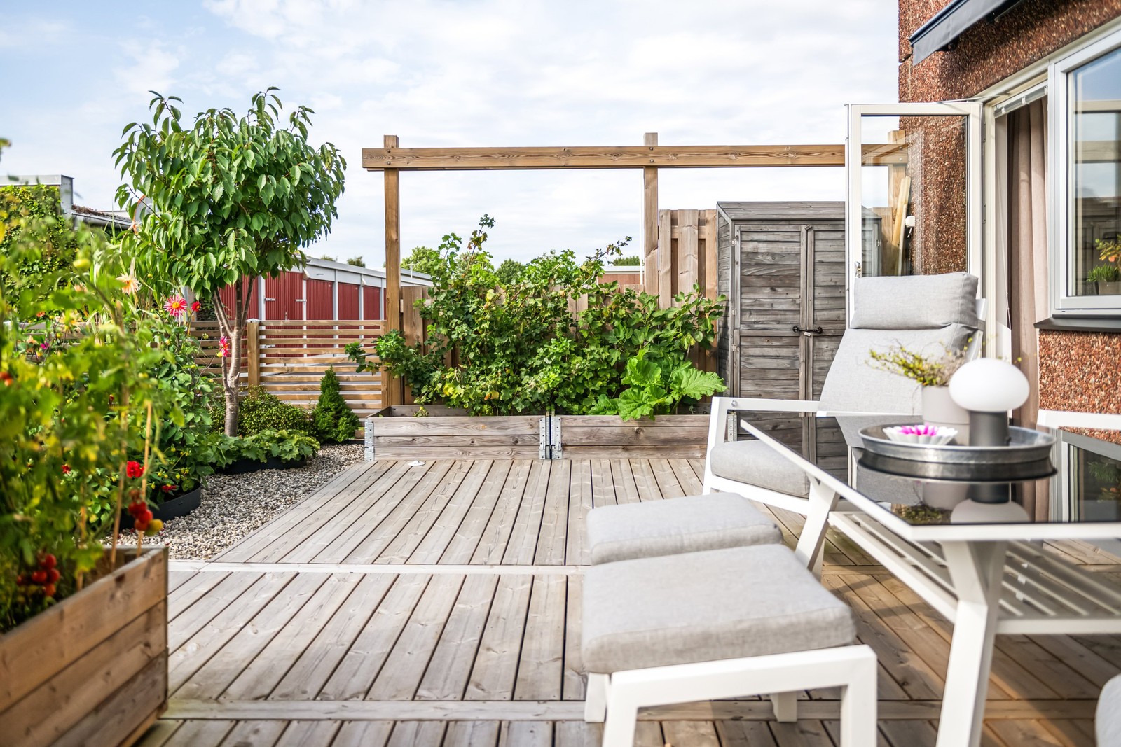 Stort härligt trädäck i soligt västerläge samt inglasad balkong med uteplats i öster.