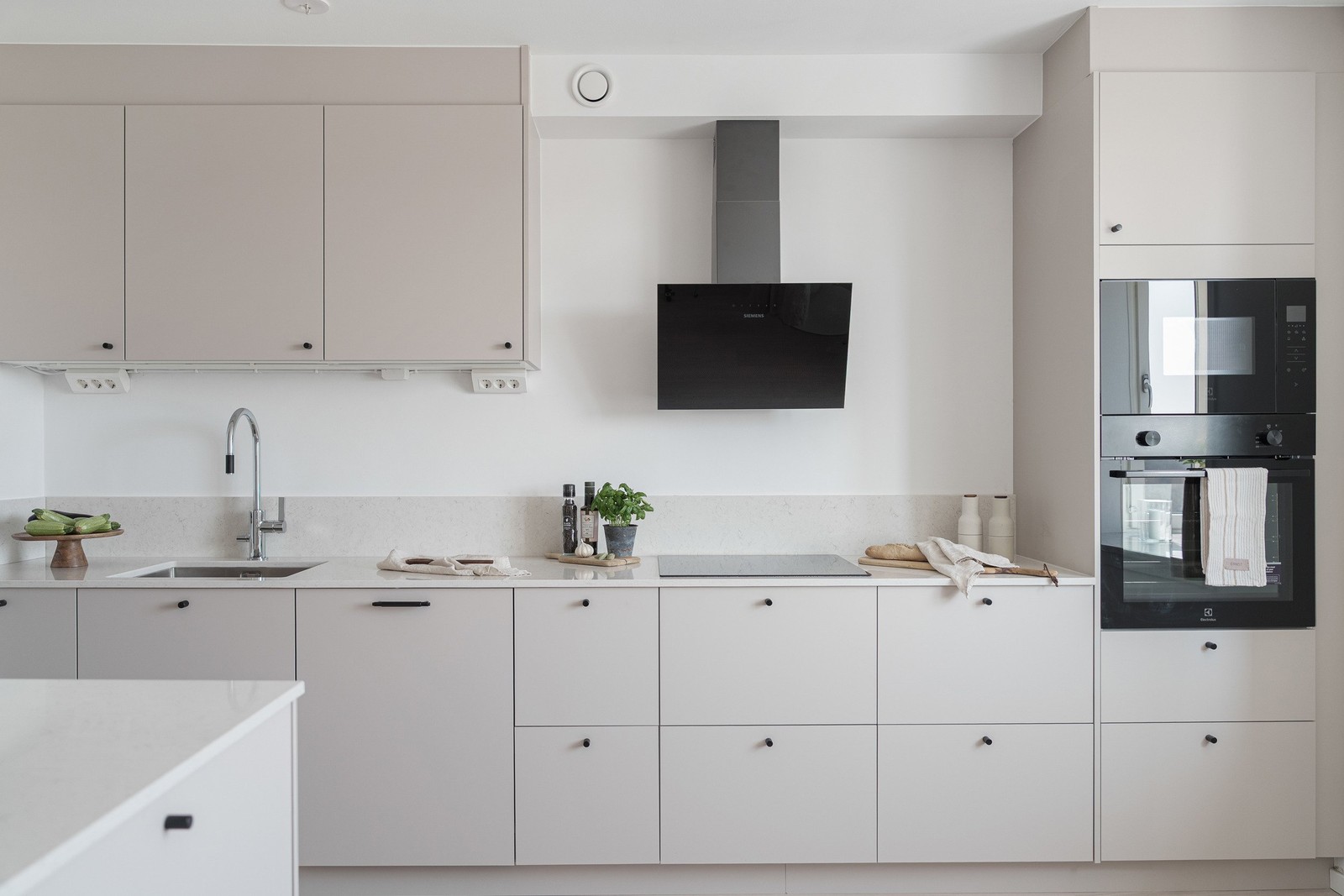 Ett modernt och sprillans nytt kök från Ballingslöv i en beige kulör, inrett med: inbyggd ugn, inbyggd mikro, spishäll, köksfläkt, integrerad kyl/frys, integrerad diskmaskin samt nedsänkt vask. Bänkskivan i sten gifter sig fint tillsammans med kulören på köksluckorna. Köket erbjuder bra av förvarings- och avlastningsmöjligheter. Det finns möjlighet att möblera med ett köksbord för fyra personer. Utsikten från köket vilar i österläge där ni kan njuta av de grönskande träden från Karlslundsparken.