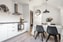 Ett vitt stilrent kök som erbjuder goda förvaringsmöjligheter samt bra med avlastningsytor. Kökets storlek är helt magisk med tanke på lägenhetens yta, en plats att samlas på. Bänkskivan i laminat matchar bra med de vita skåpsluckorna samt det vita kaklet ovanför. Köket är utrustat med: spishäll, inbyggd ugn, köksfläkt, diskho, kombinerad kyl/frys och inbyggd mikro. Köket erbjuder matplats för minst 4 personer och sittplatserna kan utan problem dubblas för middagsbjudning. Väggarna är vitmålade och på golvet ligger det laminat.