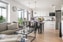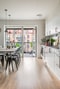 Vardagsrummet har öppen planlösning mot köket som har vit inredning från Marbodal med bänkskivor i svart laminat samt stänkskydd i vit marmorliknande Carrara. Här ligger vitpigmenterat parkettgolv i ek och vitmålade väggar och det är gott om plats till både matbord och soffmöblemang. Smart platsbyggd förvaring runt tv:n med vitrinskåp kan ingå i köpet och ger extra förvaringsmöjligheter. Utrustningen i köket består av induktionshäll, varmluftsugn, mikro, kyl i rostfritt, frys i rostfritt, kolfilterfläkt och diskmaskin i rostfritt. Här hittar vi även utgången till den inglasade balkongen som ligger i nordvästläge där man kan njuta av kvällssolen om sommaren!