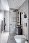 Ett modernt helkaklat badrum som direkt ger en känsla av hotell, badrummet går grå kulör, inrett med: duschhörna, vägghängd toalett, vask med tillhörande kommod samt tvättmaskin.